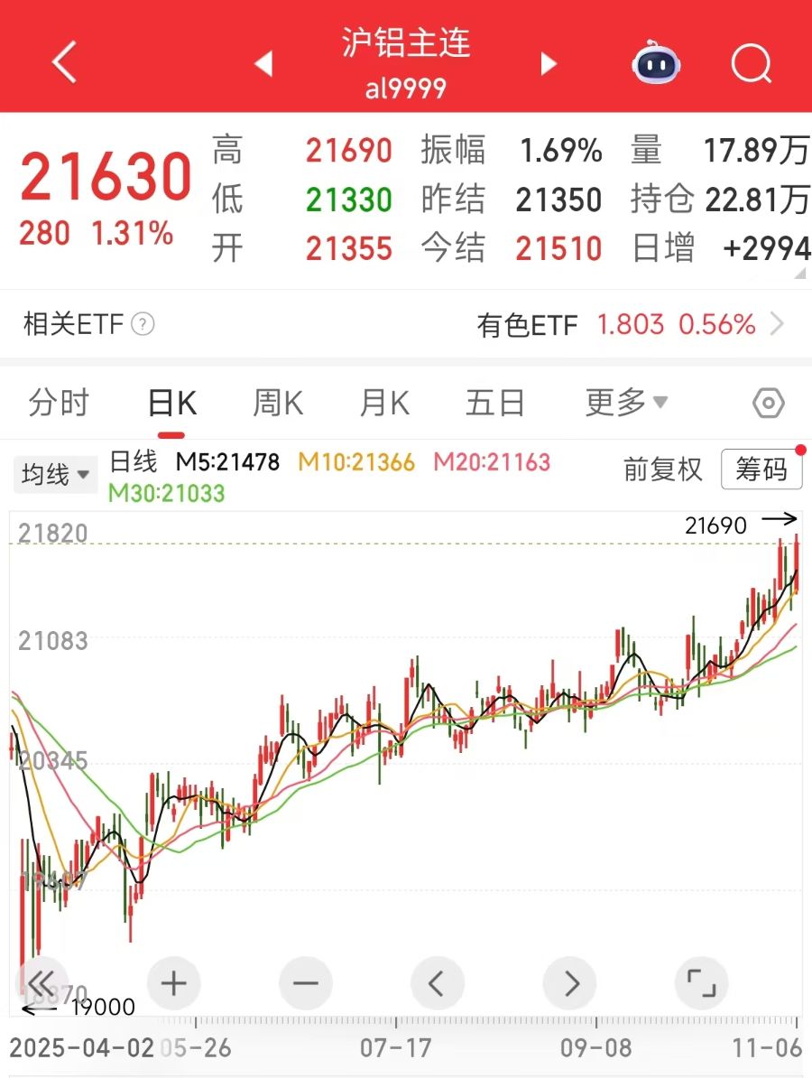 11月6日,多家铝职业公司大涨,其间,我国铝业(601600.SH)、闽发铝业(002578.SZ)、豪美新材(002988.SZ)、常铝股份(002160.SZ)、南山铝业(600219.SH)涨停。其间,我国铝业在今天涨停后,市值已超越1800亿元。